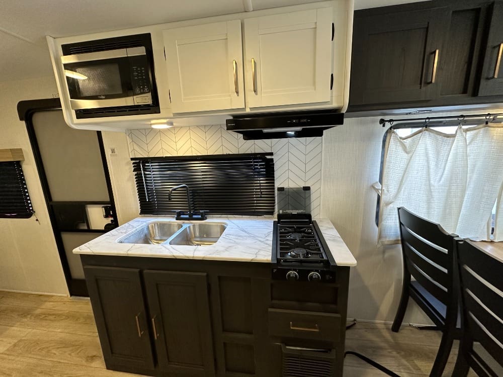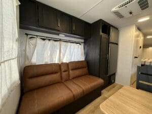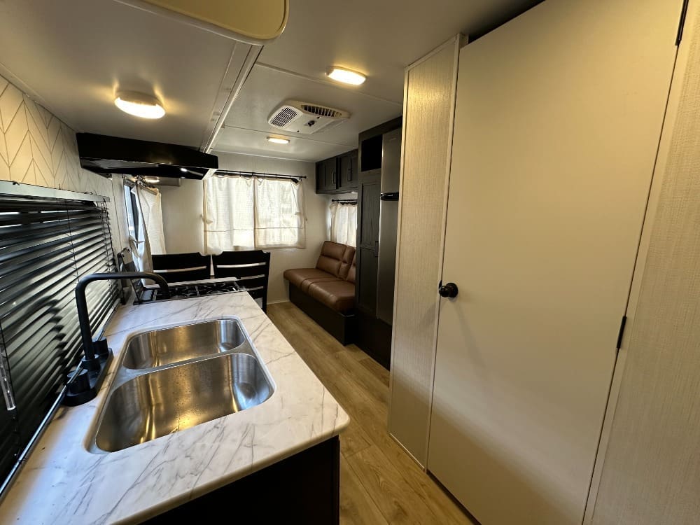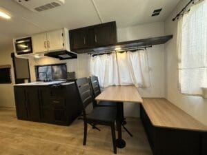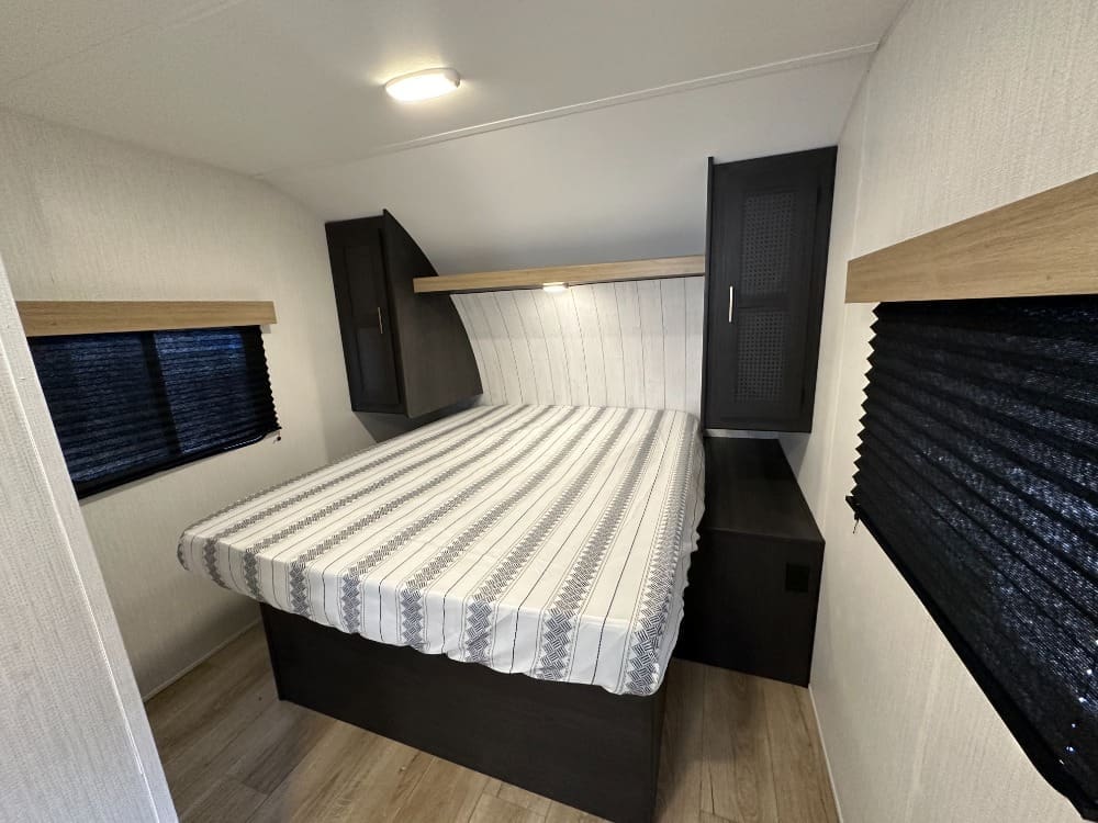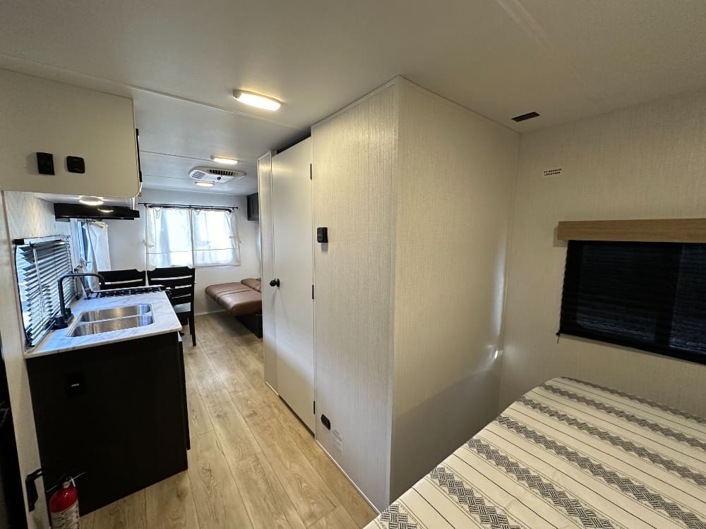 Inside, you’ll find a spacious rear dinette with large windows for great views, a fully equipped kitchen with a three-burner stove and microwave, and a comfortable front queen bed. The bathroom features a walk-in shower, and there’s plenty of storage throughout.